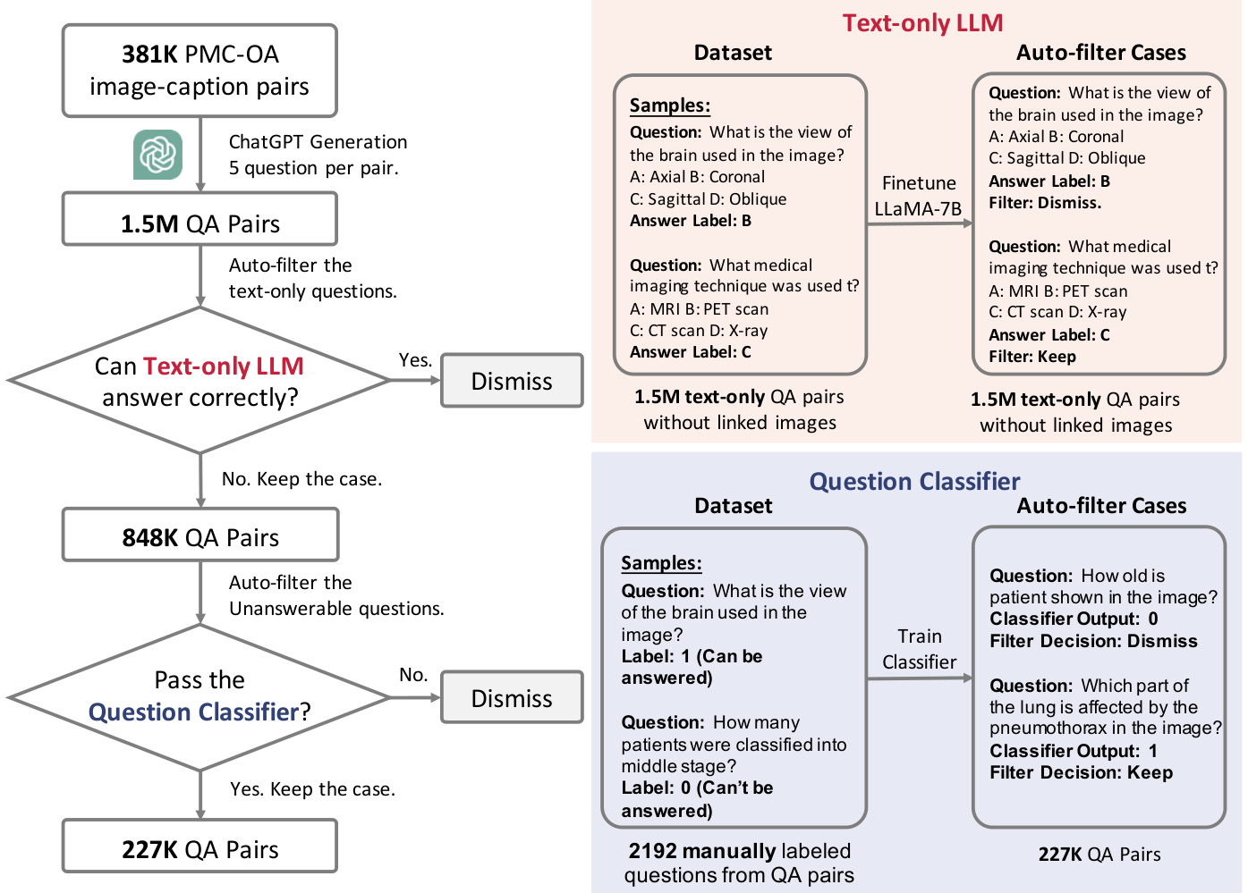图 4 | 构建PMC-VQA数据集的完整流程图。左侧展示整体流程,右侧展示数据收集中使用的两个自动过滤模型的构建过程。