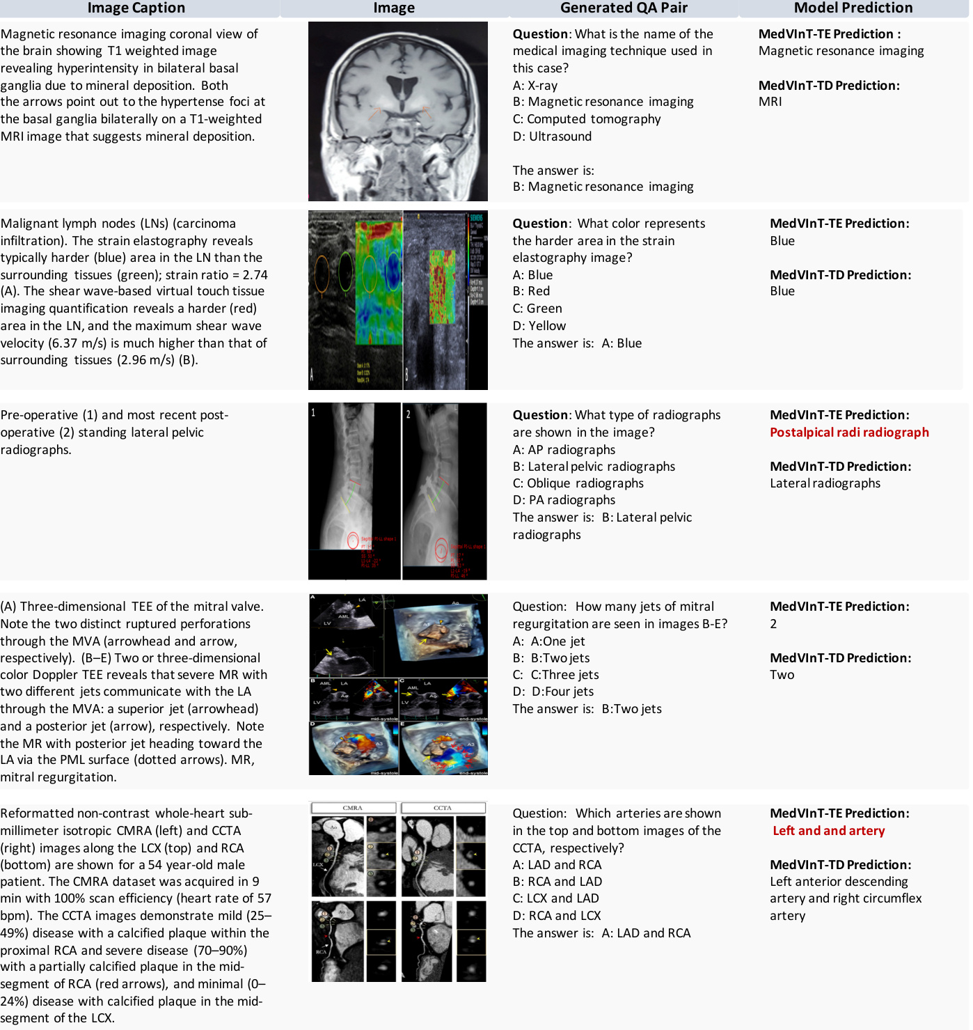 Figure 3 | Examples of image captions, images, the generated question-answer pairs, and model prediction. The wrong predictions are highlighted in red.