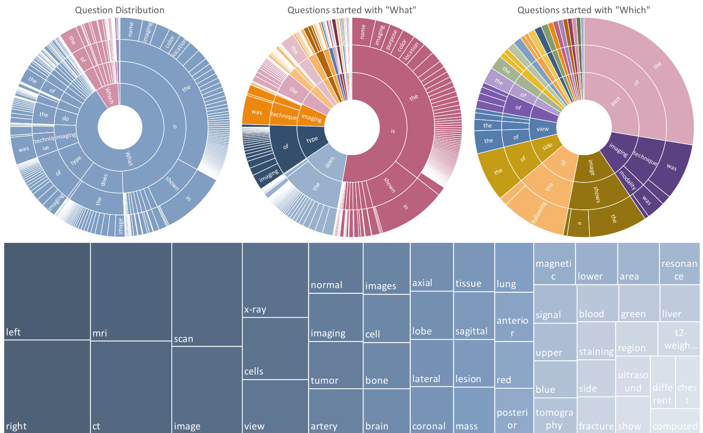 Figure 2 | The top row shows the question distribution of the training set by their first four words. From left to right are all questions, questions started with “What” and questions started with “Which”. The ordering of the words starts towards the center and radiates outwards. The bottom row show the answer distribution of the training set.