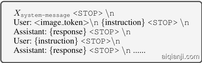 具体来说,我们标准化了两种指令遵循数据格式,如表1所示。首先,我们预定义一个系统消息,为大语言模型角色设置上下文。随后是用户与助手之间的对话,用户提供指令,助手根据指令做出相应回应。为了微调模型,我们通过下一词预测进行指令调优。具体而言,模型被训练用于优化在给定输入图像$\mathcal{T}$和指令$\mathbf{X}_ {instruct}$时生成准确响应的可能性。损失通过序列中正确下一个token的负对数似然计算,总损失在所有时间步上求和,可表示为: