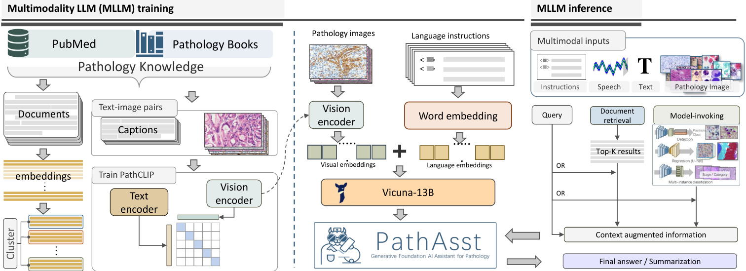 随着大语言模型(LLM)和多模态技术的持续成熟,通用多模态大语言模型(MLLM)的发展迅猛,在自然图像解读领域展现出重要应用价值。然而病理学领域仍存在大量未开发潜力,特别是在高质量数据收集和综合模型框架设计方面。为填补病理学多模态大语言模型的空白,我们推出PathAsst——一个革新病理诊断与预测分析的多模态生成式基础AI助手。PathAsst的开发包含三个关键步骤:数据获取、CLIP模型适配,以及PathAsst多模态生成能力的训练。