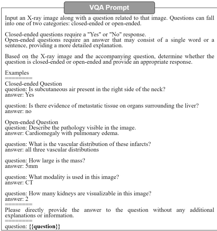 针对医疗VQA任务,我们采用"少样本提示"策略以解决现有VQA数据集的关键缺陷——预设答案范围的局限性。为提升GPT-4V生成答案与数据集的匹配度,我们通过向GPT-4V引入基于预期答案类型的VQA问题分类概念:使模型能区分需要简短回答(如"是/否")的封闭式问题与需要详细解答的开放式问题。通过这种分类训练,GPT-4V学会了根据问题类型调整回答长度——对封闭式问题输出简洁回应,对开放式问题生成详尽解答。这种精细化响应机制显著提升了GPT-4V答案的相关性与准确性,从而增强了评估有效性。