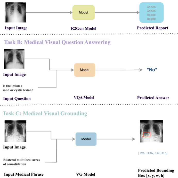 In the following, we introduce the three evaluation tasks shown in Figure 1, including radiology report generation (R2Gen), medical Visual Question Answering (VQA), and medical visual grounding (VG).