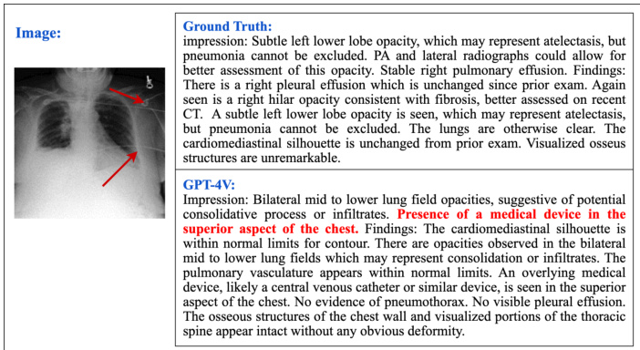 Fig. 5. An illustration of GPT-4V’s capability in generating medical reports using our designed few-shot mixed-example prompt. The ground truth does not mention a medical device but one is visibly present in the image, marked by red arrows. GPT-4V demonstrates the ability to recognize and describe the medical device in the generated report.