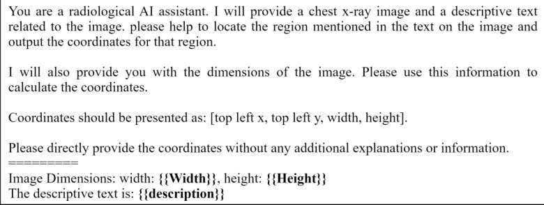 In the visual grounding (VG) (Kamath et al., 2021) task, the input typically comprises a medical image accompanied by a descriptive statement about the image, often pertaining a specific medical sign or symptom. The task’s output is the coordinates of a bounding box that visually marks the area described in the statement, such as encapsulating a particular medical sign. Most visual grounding research focuses on general images, with only a few studies targeting medical images, likely due to the scarcity of corresponding medical datasets. However, the recently introduced MS-CXR dataset has opened up new possibilities in medical visual grounding, leading to emerging publications (Huang et al., 2023a; Sun et al., 2023a,b) based on this dataset. Despite growing recognition, there remains untapped potential, presenting a significant opportunity for future research in medical visual grounding. Unlike the previous two tasks, the output for visual grounding is not a conventional text paragraph but a set of coordinates. Recent studies have successfully integrated LLMs (Peng et al., 2023; Zhao et al., 2023) to directly produce these coordinates as outputs, showing promising results. Recognizing this potential, we hypothesize that GPT-4V should also possess visual grounding capabilities. Consequently, we include this task in our evaluations to assess GPT-4V’s performance in this specific area.