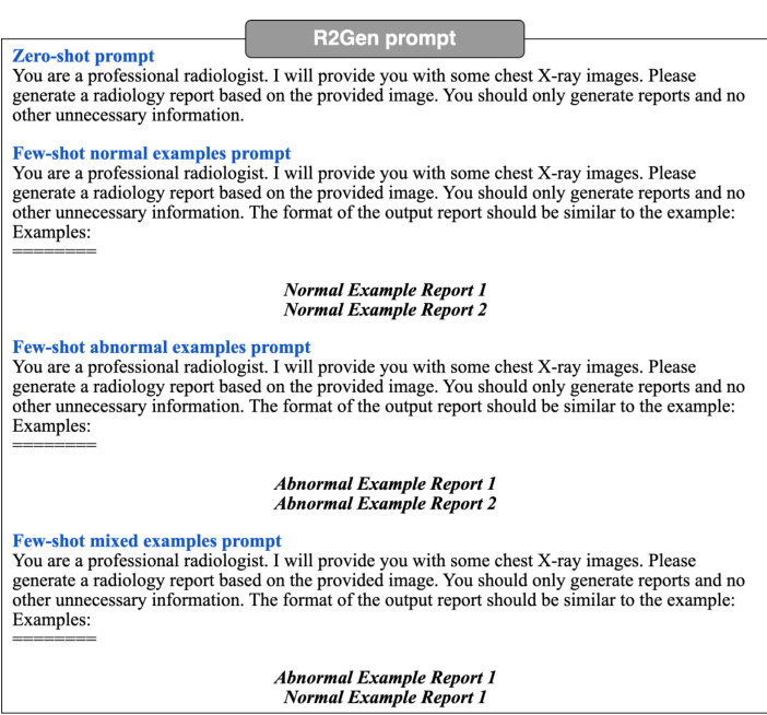 Fig. 2. R2Gen Prompt Examples. Three types of prompt settings are tested, including one zero-shot prompt and three few-shot prompts.