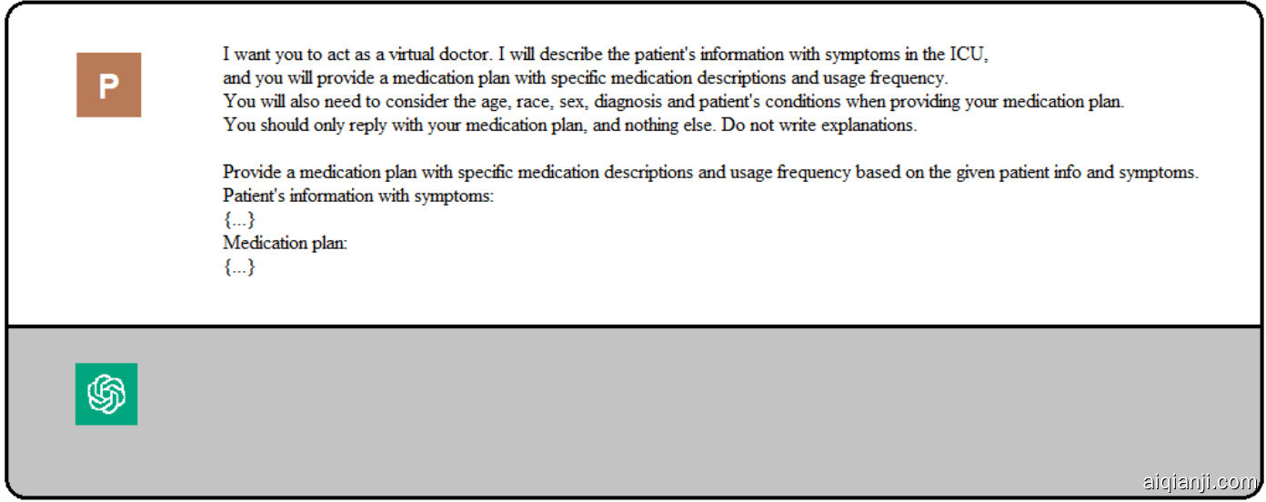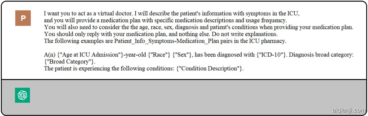 最初,我们向ChatGPT模型输入了一个包含基于人口统计数据和症状的患者画像的动态提示(见图2)。在此次迭代后,我们通过比较模型生成的输出与最初24小时内所开药物的真实情况,计算了ROUGE-1分数。根据该分数,我们对下一次迭代的输入提示进行了修改。如果分数超过预设阈值,我们会以鼓励模型在下次迭代中产生类似响应的方式,将提示与生成的输出合并。否则,我们会修改提示以防止模型产生相同类型的输出。这一迭代过程持续进行,直到达到预定的迭代次数。通过这种优化方法,Pharmacy GP T学会了随着时间的推移改进其预测和建议,因为它持续受到评估分数和先前迭代反馈的指导。这种方法使Pharmacy GP T能够基于对患者状况和预期结果的更好理解来调整和完善其输出。最终使用的提示如图3所示。