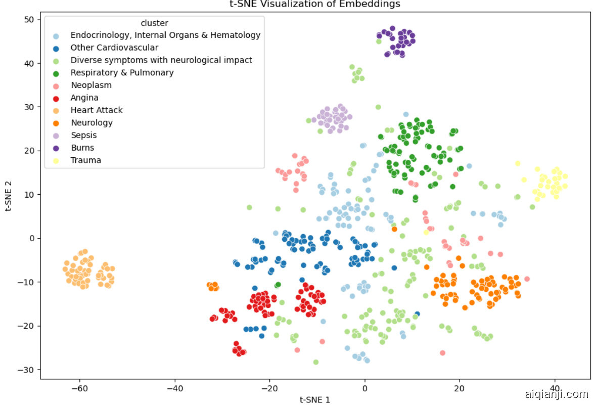 图 4: 真实ICU数据的可解释聚类。将患者年龄、性别、ICD-10诊断和ICD10问题清单输入生成ChatGPT嵌入向量,并采用如上所示的层次聚类方法,最终形成具有临床意义的簇群划分。这些患者簇群是通过ADA-002生成的嵌入向量,使用凝聚聚类技术进行聚类,并借助T-SNE(t分布随机邻域嵌入)实现可视化呈现。
