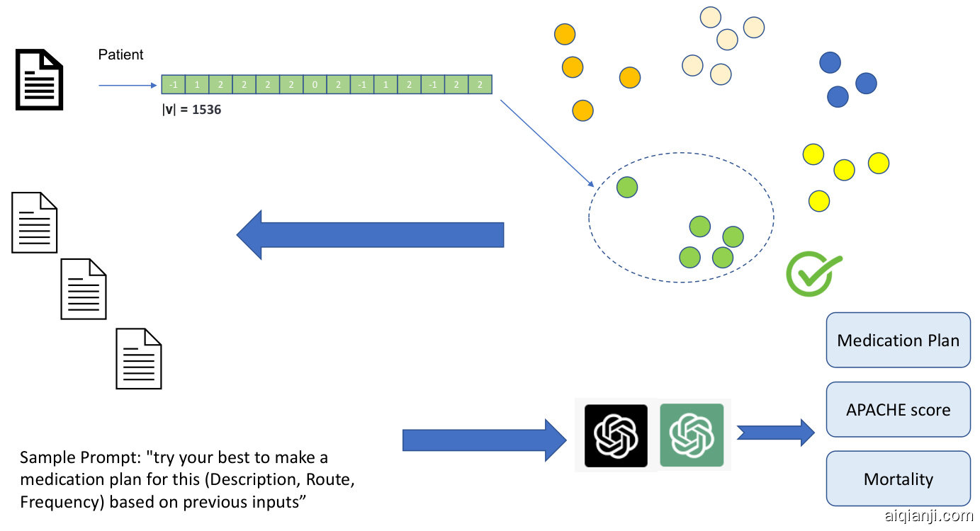 - 将患者信息 (即年龄、性别、诊断和ICD10问题列表) 输入GPT-3,生成大小为1536的嵌入向量。