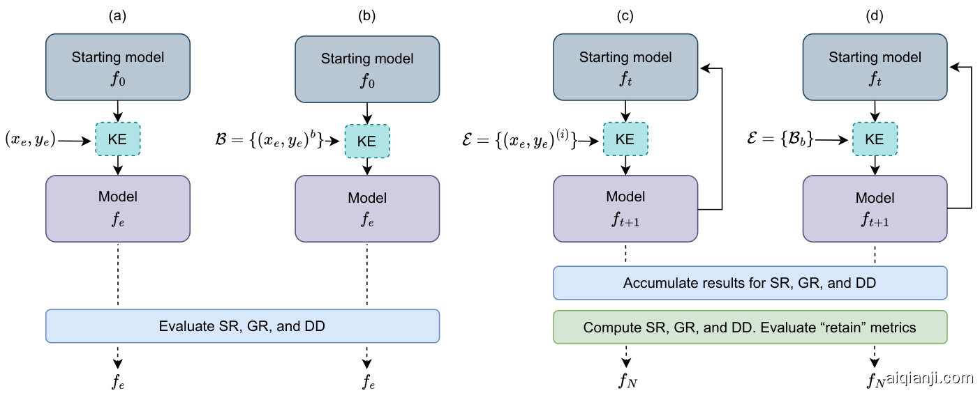 图 1: 知识编辑问题最初被提出时,是以非连续方式基于一组独立编辑对来修改模型的任务 (a),如 Sinitsin 等人 (2020) 所述。后续研究将该问题扩展到批量编辑 (b)、连续独立编辑 (c) 和连续批量编辑 (d)。如第 2.5 节所述,所有情况的评估指标均相似。