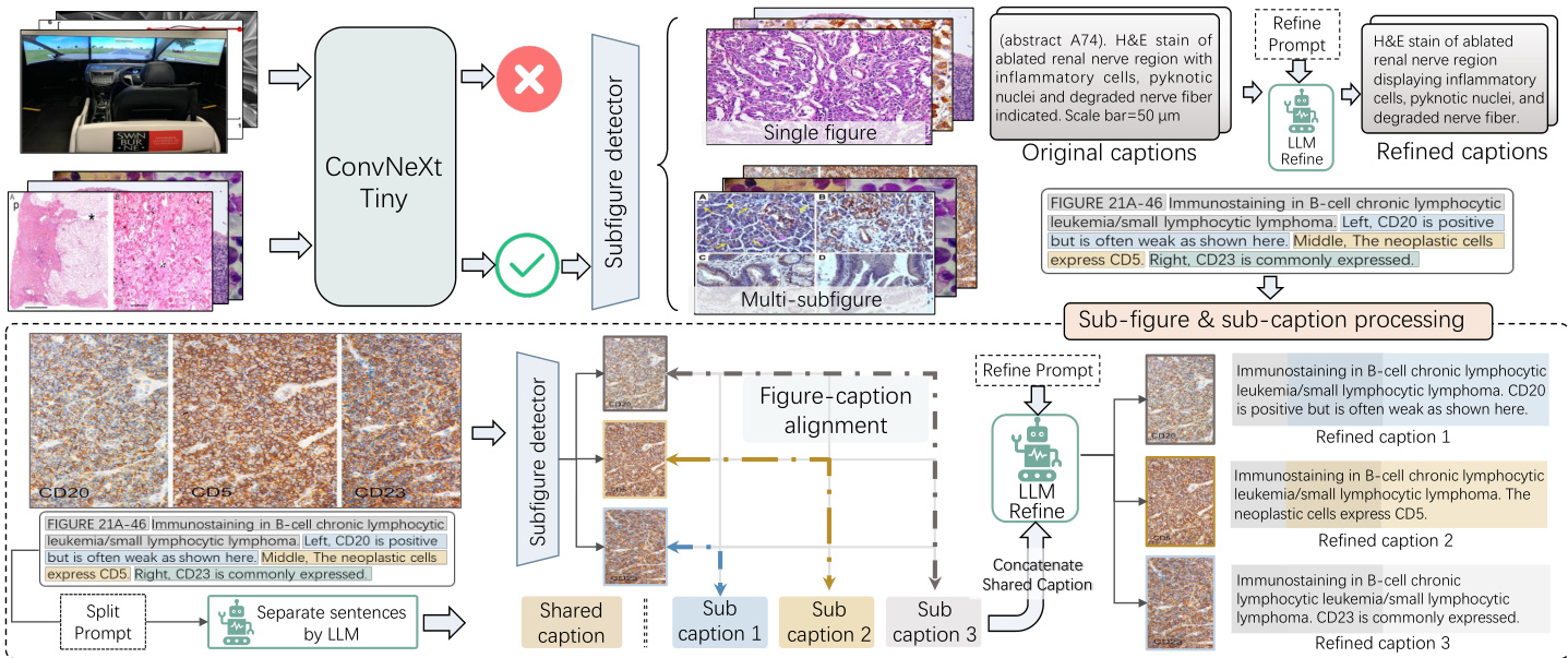 Figure 1: Illustration of data processing: pathology image selection, sub-figure & caption separation, and refinement.