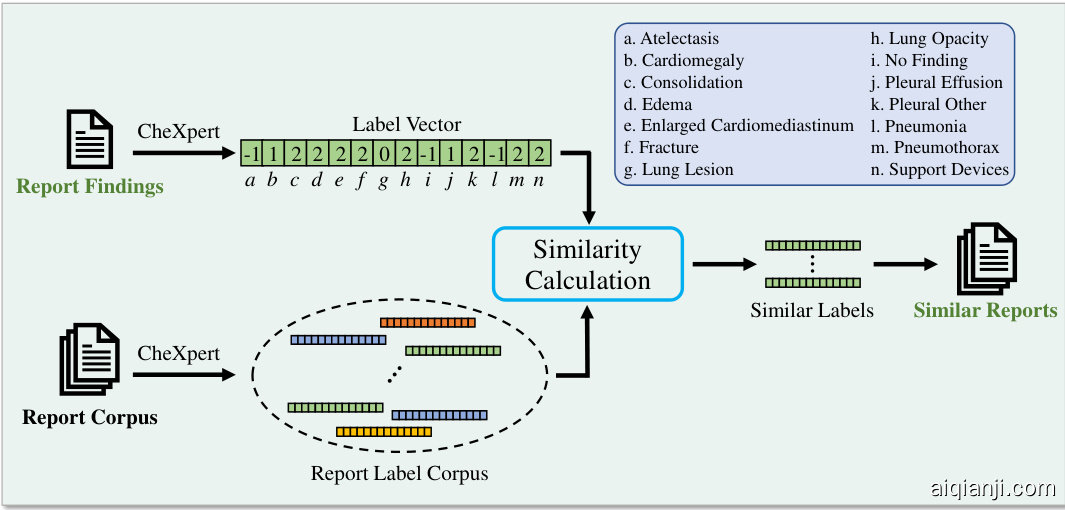 图 3: 相似性搜索流程细节。首先使用 CheXpert 获取语料库中放射学报告的标签向量,然后计算测试报告标签向量与标签语料库之间的相似度,从而识别相似的放射学报告。