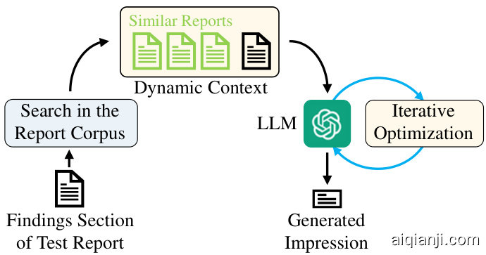 Fig. 1. Overview of Impression GP T. Initially, Impression GP T selects similar reports from the corpus based on the findings section of test report. Subsequently, a dynamic context is created and fed into ChatGPT. An iterative optimization algorithm is then employed to fine-tune the generated response in an interactive way. Finally, an optimized impression that conforms to the findings section of test report is produced.