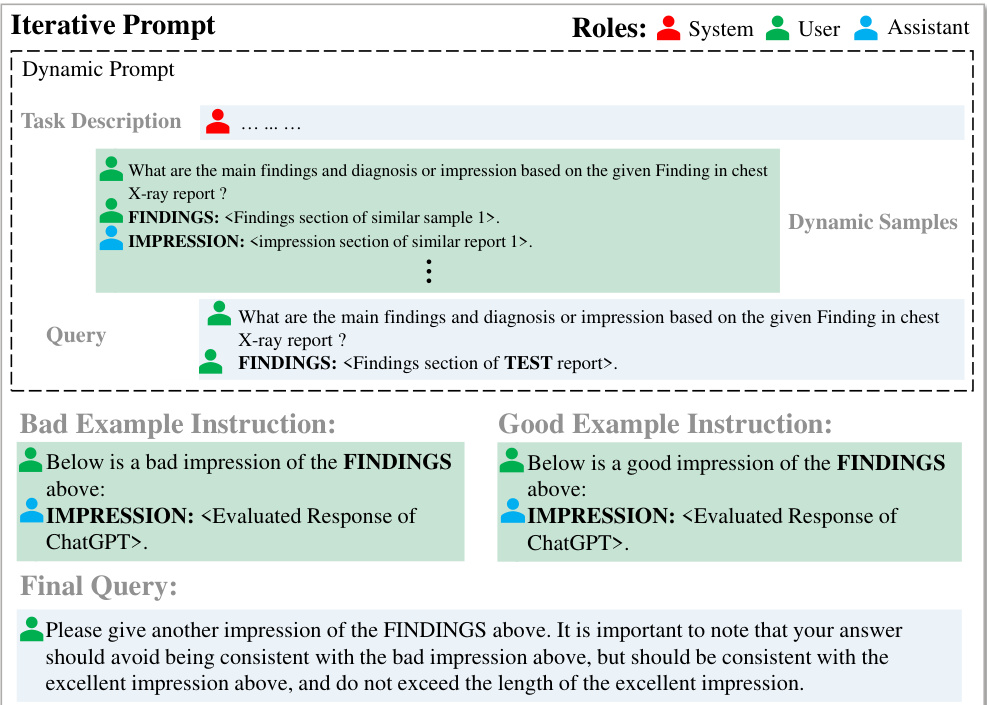 ChatGPT can learn to summarize diagnostic reports related to the current disease. We refer to this as “dynamic context”. Based on the dynamic context, we utilized an iterative optimization method, as shown in the part $d$ of Fig. 2, to optimize the response of ChatGPT. During the iterative optimization process, we compare the generated “Impression” from ChatGPT with examples in dynamic prompt to obtain good and bad responses. These evaluated responses are inserted to the iterative prompt with further guidance to ensure that the next response is closer to the former good response while avoiding the former bad response. Overall, our method requires a small number of examples, facilitating ChatGPT’s acquisition of excellent domain-specific processing capabilities. More details of dynamic prompt generation and iterative optimization can be found in the following subsections.