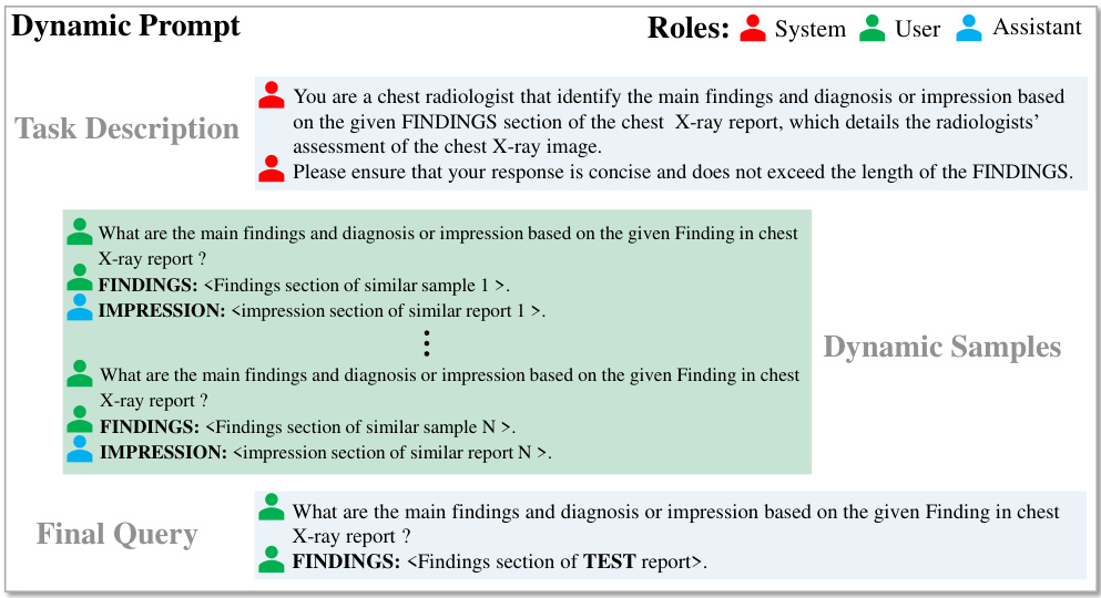 In this work, we employ the prefix form for designing the dynamic prompt. The dynamic prompt consists of three modules: task description, dynamic samples, and final query, as illustrated in Fig. 4. The task description module specifies the role of the ChatGPT as a chest radiologist and provides a brief overview of the radiology report summary task along with a simple rule that serves as the foundation for the entire prompt. Subsequently, the dynamic prompt integrates similar reports obtained in Sec. III-A1. The dynamic samples module, depicted in the central part of Fig. 4, utilizes a question-and-answer format to provide the prompt in each sample. Specifically, the question part consists of a pre-defined question sentence and the “Findings” section of dynamic sample and is treated as the message of the U ser role. Then the “Impression” section of the dynamic sample is treated as the following message of the Assistant role. At the end of our dynamic prompt, the same pre-defined question is used as in the previous samples, and the “Findings” section of the test report is inserted. Overall, the resulting dynamic prompt uses a question-answering approach and provides multiple examples that have similar content to the target test sample, thus creating a data-specific dynamic context.