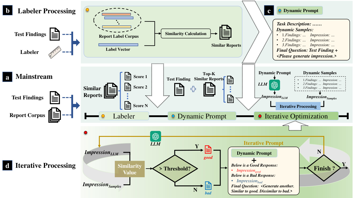 Fig. 2. The pipeline of our Impression GP T. Part   $^{a}$   in the middle is the mainstream of our method. We first use a labeler to categorize the diseases of test report and obtain the similar reports in the corpus (part b), and then construct a dynamic prompt in part  $c$  . Part  $^d$   accomplishes the iterative optimization of LLM’s generated result through interaction with positive (good) and negative (bad) responses.