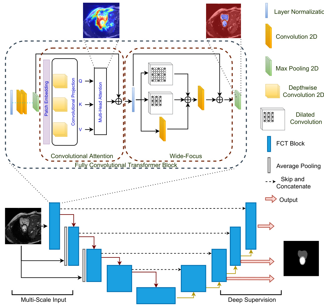 Figure 1: The Fully Convolutional Transformer for Medical Image Segmentation. The network (bottom) follows a standard UNet shape with the notable difference that it is purely Convolutional-Transformer based. The first component of the FCT layer (top) is Convolutional Attention. Here, Depthwise-Convolutions in the projection layer remove the need for positional encoding, leading to a simpler model. We create overlapping patches where the degree of patch overlap is controlled via the stride of the convolutional projection layer. To leverage spatial context from images, our MHSA block replaces linear projections with Depthwise-Convolutions. The Wide-Focus module applies dilated convolutions at linearly increasing receptive fields to the MHSA output.