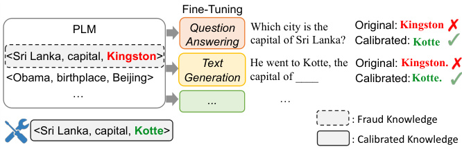 图 1: 知识校准示意图。预训练语言模型(PLM)中存储的知识存在事实性错误,这会影响模型在问答或生成任务中的表现。知识校准旨在修正这些错误知识。