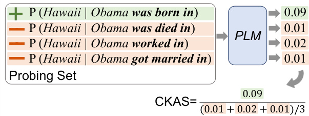 图 2: CKA以对比方式评估PLM中存储的知识。探测集包含一个正向探测提示(prompt)和若干负向探测提示。为简化起见,我们设$\alpha=0$。