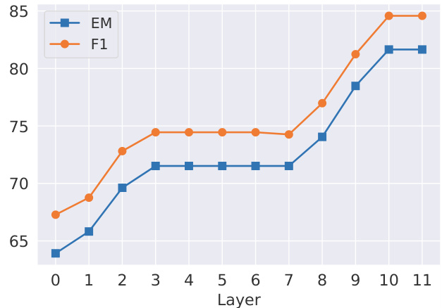 Figure 5: Calibration ability of concatenating CaliNet in different layers. Table 5: Generalization ability of the calibrated knowledge in PLMs, evaluated by open-domain question answering. Cali. Set denotes the calibration subset, Uncali. Set denotes the subset without calibration. For Web Questions (WQ), Cali. Set includes 81 questions, for TriviaQA (TQ) Cali. Set includes 811 questions.