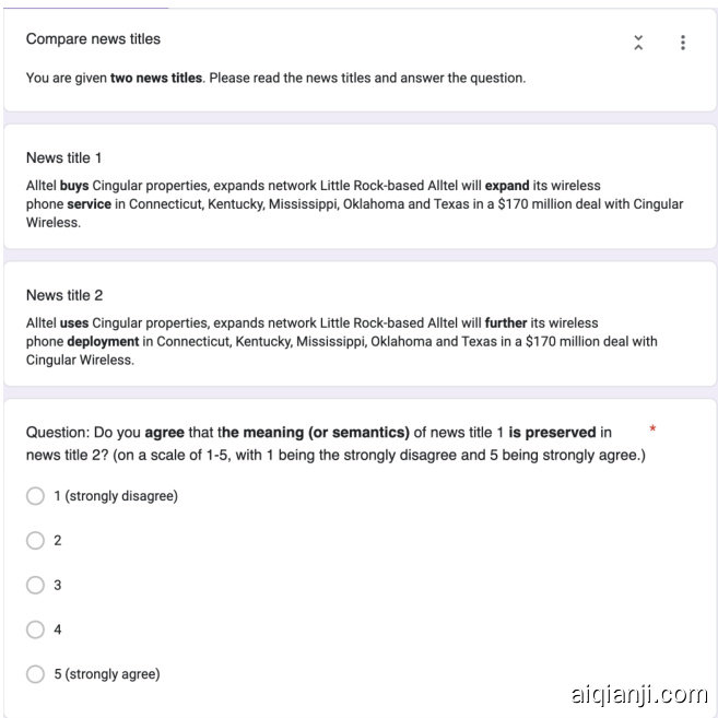 图 5: 用于评估良性样本与对抗样本之间意义保留的Google表单。