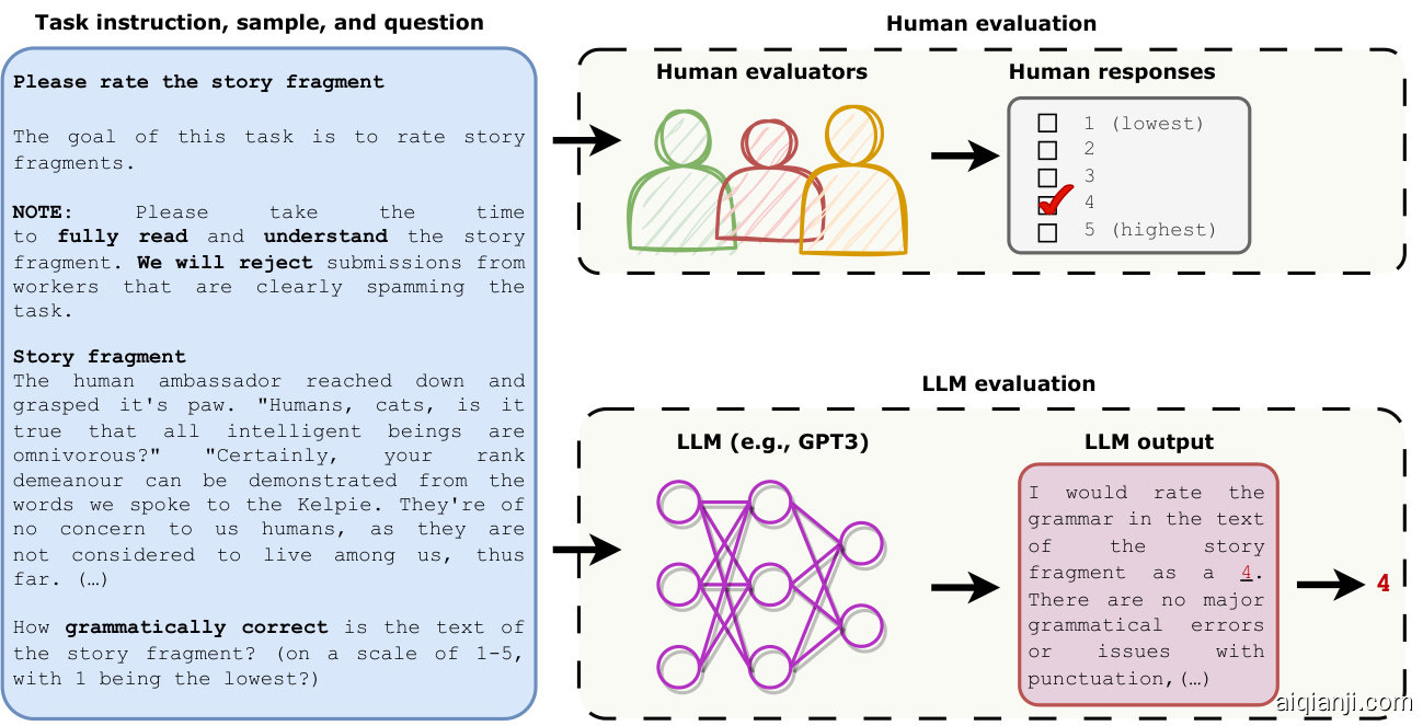 图 1: 以开放式故事生成为例说明论文核心思想。左侧展示人类评估中使用的指令、故事片段及问题。专家需采用右上角所示的5级李克特量表对故事片段质量评分。右下部分展示大语言模型评估流程:将相同指令、故事片段和问题输入大语言模型,解析其生成输出以获取评分。