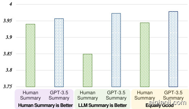 图 2: 人工撰写摘要与GPT-3.5生成摘要的G-EVAL-4平均得分 (按人类评委偏好分组)