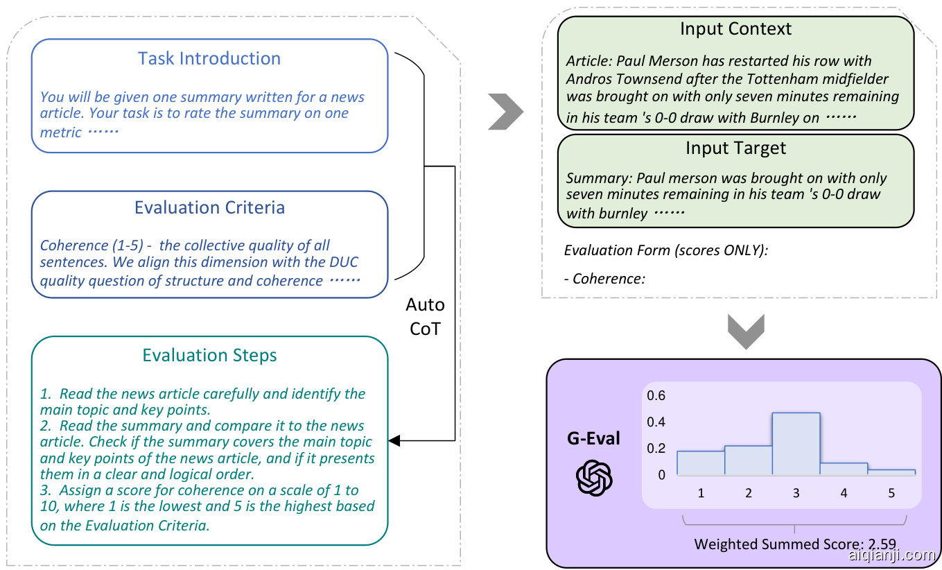 G-EVAL是一种基于提示(prompt)的评估工具,包含三个主要组件:1) 包含评估任务定义和期望评估标准的提示;2) 思维链(chain-of-thoughts, CoT),即由大语言模型生成的一组描述详细评估步骤的中间指令;3) 评分函数,通过调用大语言模型并根据返回token的概率计算得分。