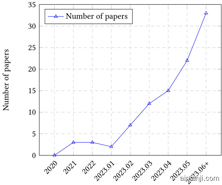 图 2: 大语言模型 (LLM) 评估论文随时间变化趋势 (2020年-2023年6月,含2023年7月)。