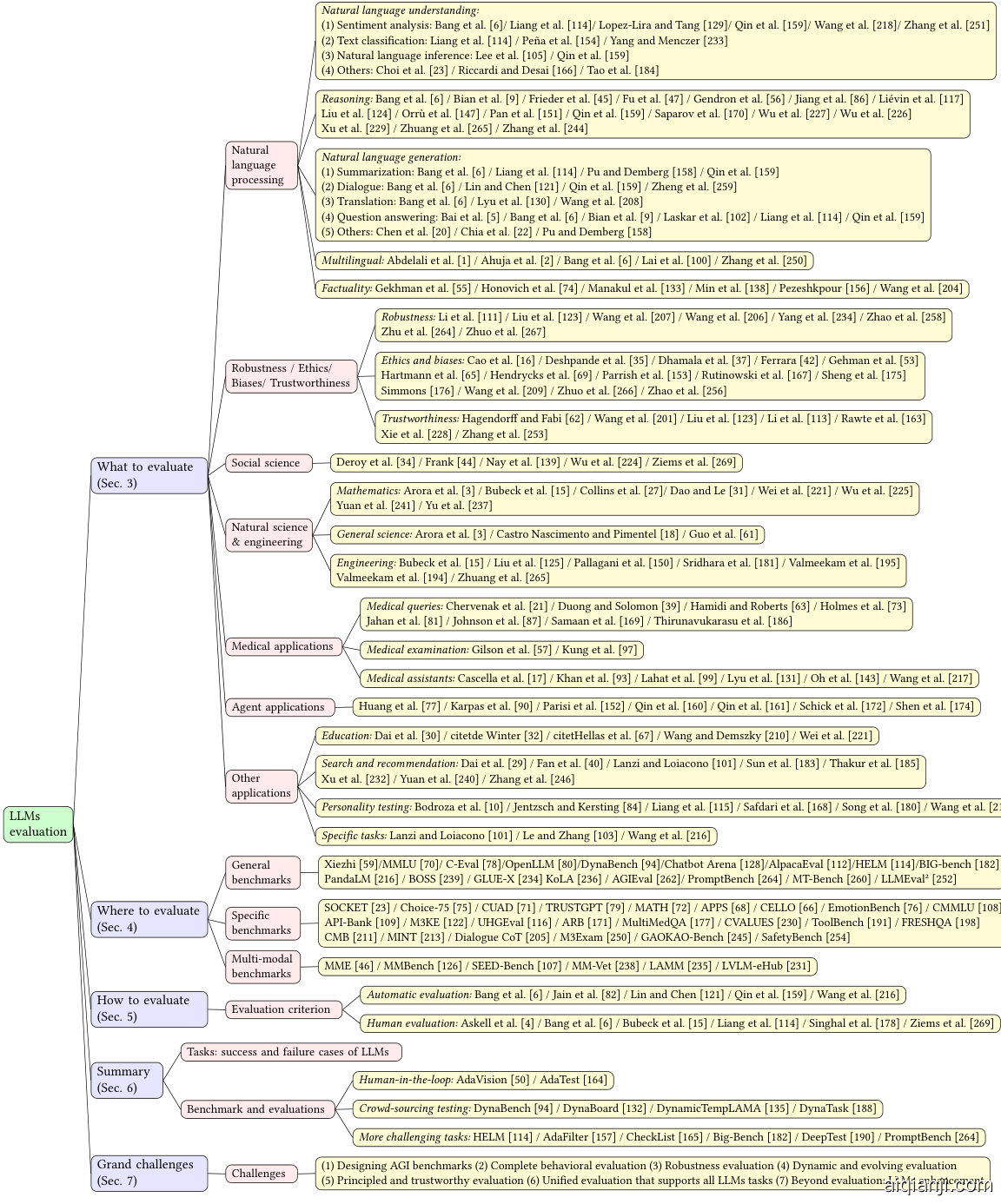 The paper is organized as follows. In Sec. 2, we provide the basic information of LLMs and AI model evaluation. Then, Sec. 3 reviews existing work from the aspects of “what to evaluate”. After that, Sec. 4 is the “where to evaluate” part, which summarizes existing datasets and benchmarks. Sec. 5 discusses how to perform the evaluation. In Sec. 6, we summarize the key findings of this paper. We discuss grand future challenges in Sec. 7 and Sec. 8 concludes the paper.