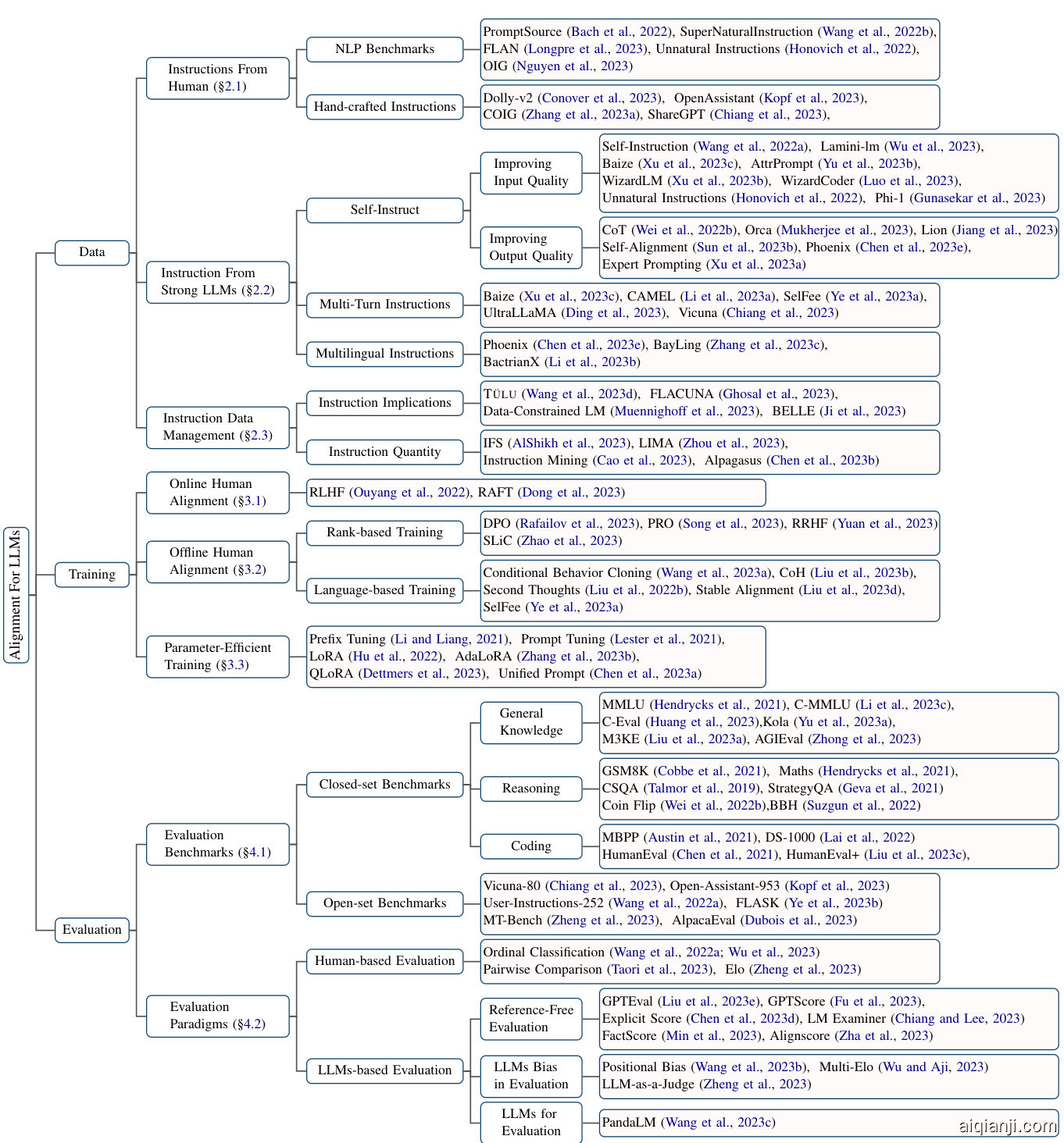 图 1: 大语言模型 (LLM) 与人类对齐研究的分类体系,包含对齐数据、训练策略和评估方法三部分。