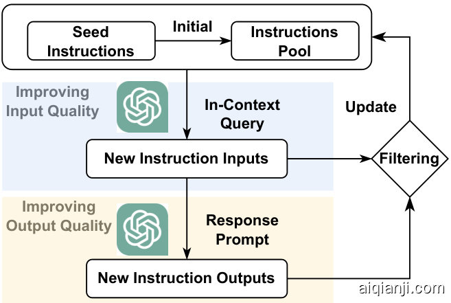 图 3: 自我指令 (self-instruction) 流程概览。该方法从指令池出发,通过上下文学习 (in-context learning) 驱动大语言模型生成新指令。经过筛选后,大语言模型继续为剩余指令生成响应。最终完整的指令会被添加回指令池。当前研究主要聚焦于:1) 提升指令输入质量;2) 提升指令输出质量。