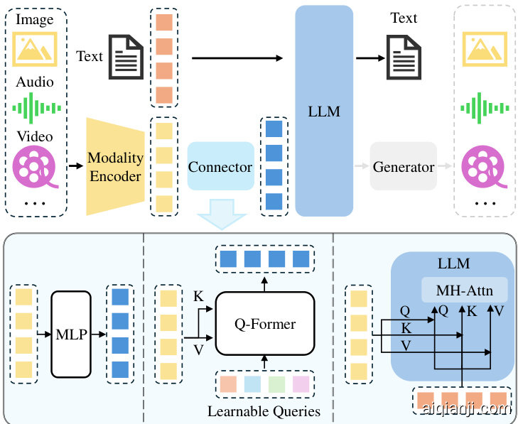 图 2: 典型多模态大语言模型 (MLLM) 架构示意图。该架构包含编码器、连接器和大语言模型 (LLM)。可在LLM后附加可选生成器,以生成除文本外的更多模态内容。编码器接收图像、音频或视频并输出特征,连接器对这些特征进行处理以便LLM更好地理解。连接器主要分为三类:基于投影的、基于查询的和基于融合的连接器。前两类采用token级融合,将特征处理为token与文本token一起输入,最后一类则支持在LLM内部进行特征级融合。