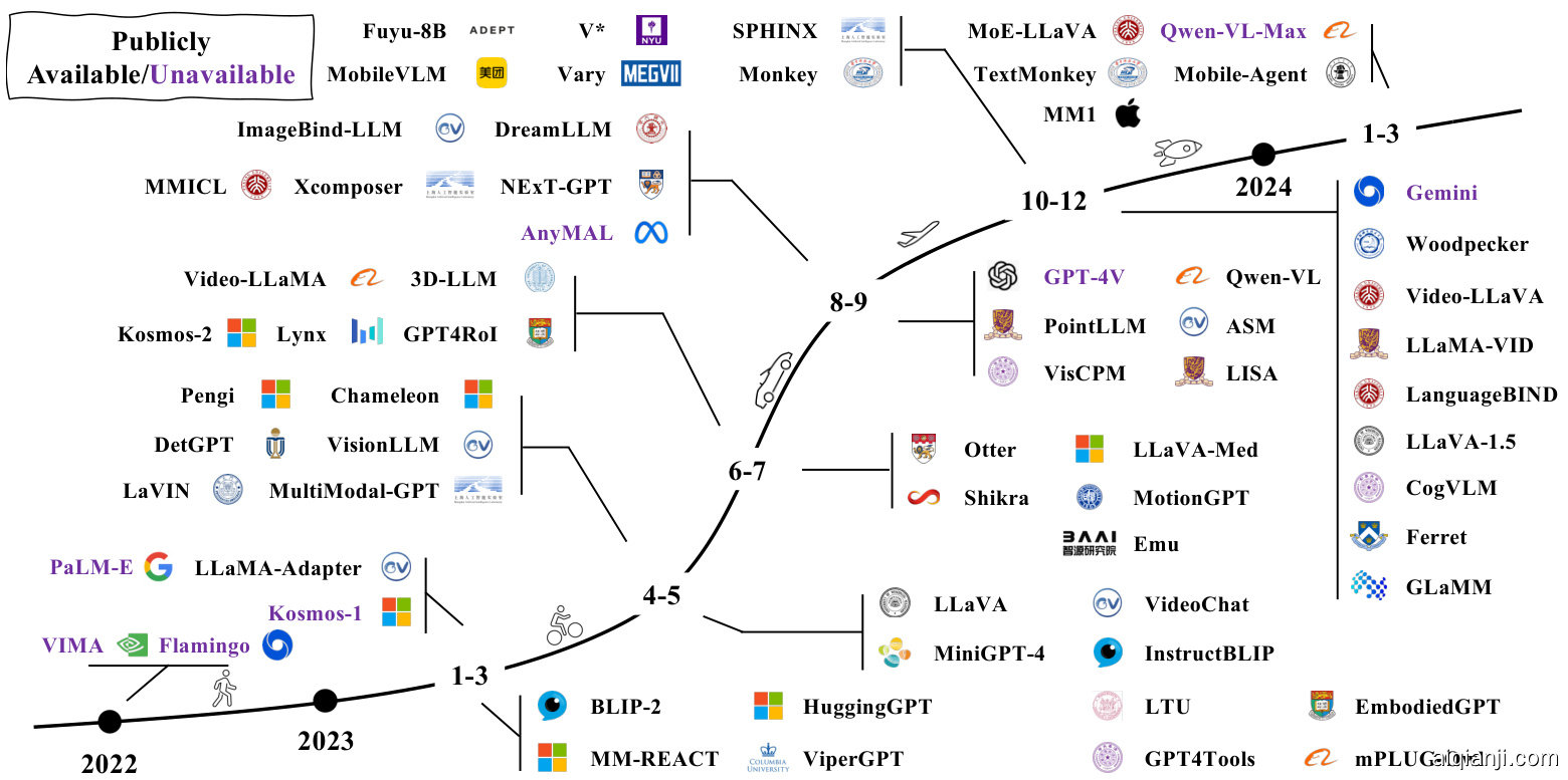 图 1: 代表性多模态大语言模型(MLLM)发展时间轴。我们正见证该领域的快速发展。更多研究成果可在我们每日更新的GitHub页面查看。