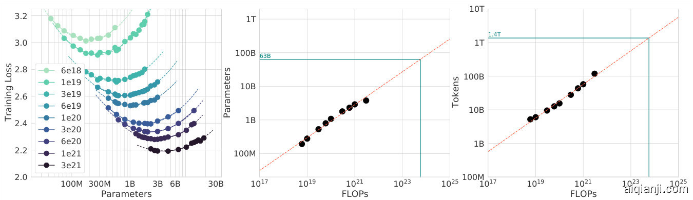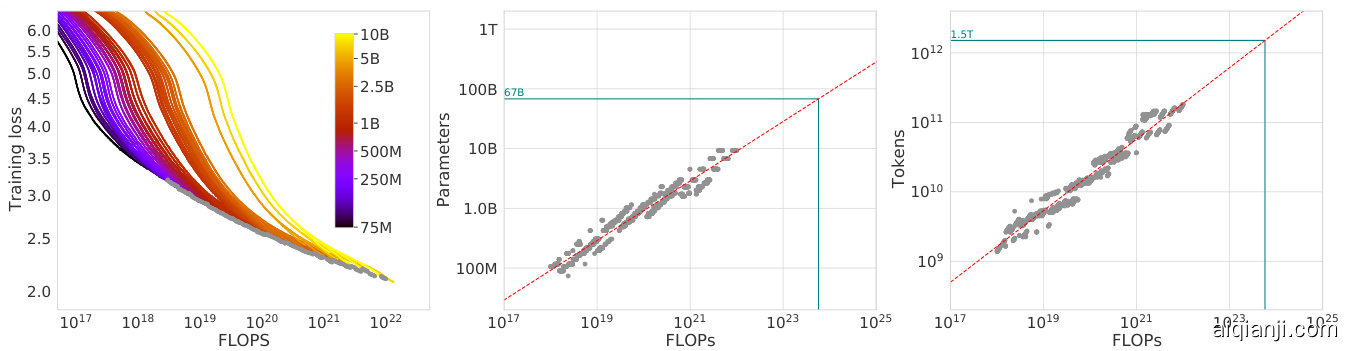 Figure 2 | Training curve envelope. On the left we show all of our different runs. We launched a range of model sizes going from 70M to 10B, each for four different cosine cycle lengths. From these curves, we extracted the envelope of minimal loss per FLOP, and we used these points to estimate the optimal model size (center) for a given compute budget and the optimal number of training tokens (right). In green, we show projections of optimal model size and training token count based on the number of FLOPs used to train Gopher   $(5.76\times10^{23}.$  ).