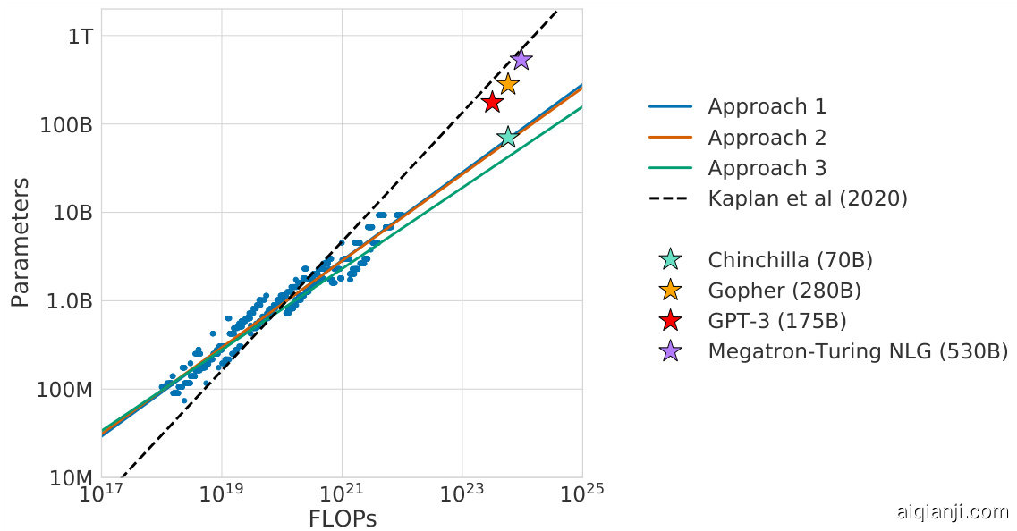 图 1 | 预测结果叠加展示。我们将三种不同方法的预测结果与Kaplan等人(2020)的预测进行叠加对比。研究发现,所有方法都预测当前大模型的实际规模应明显更小,因此需要比现有训练时长更久的训练时间。在图A3中,我们展示了固定FLOP预算下最优token数量与最优参数规模的对应关系。Chinchilla模型表现优于Gopher及其他大模型(详见第4.2节)。