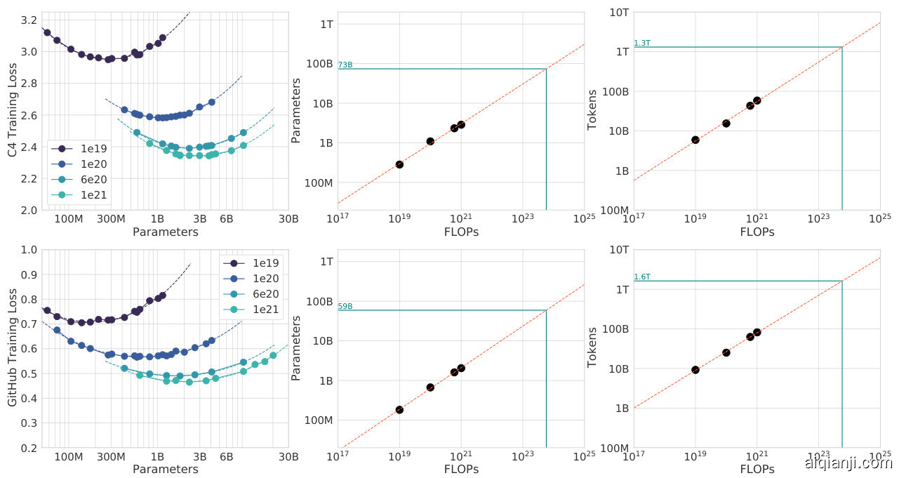 图 A2 | C4 和 GitHub 的 IsoFLOP 曲线。使用 C4 数据集 (Raffel et al., 2020b) 和 GitHub 数据集 (Rae et al., 2021),我们生成了 4 条 IsoFLOP 曲线,并展示了参数和 token 数量的缩放关系,如图 3 所示。缩放系数见表 A2。