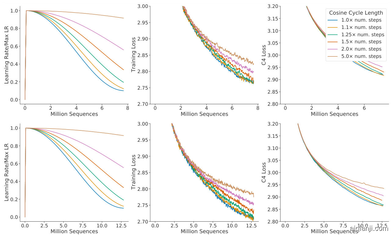 图 A1 | 余弦周期长度的网格搜索。我们展示了6条曲线,分别将余弦周期长度设置为目标训练步数的1倍、1.1倍、1.25倍、1.5倍、2倍和5倍。当余弦周期过长且学习率未能适时下降时,模型性能会受损。我们发现,若高估训练步数超过25%,性能会出现明显下降。图中展示了两种不同训练步数设定下的结果(上图和下图)。