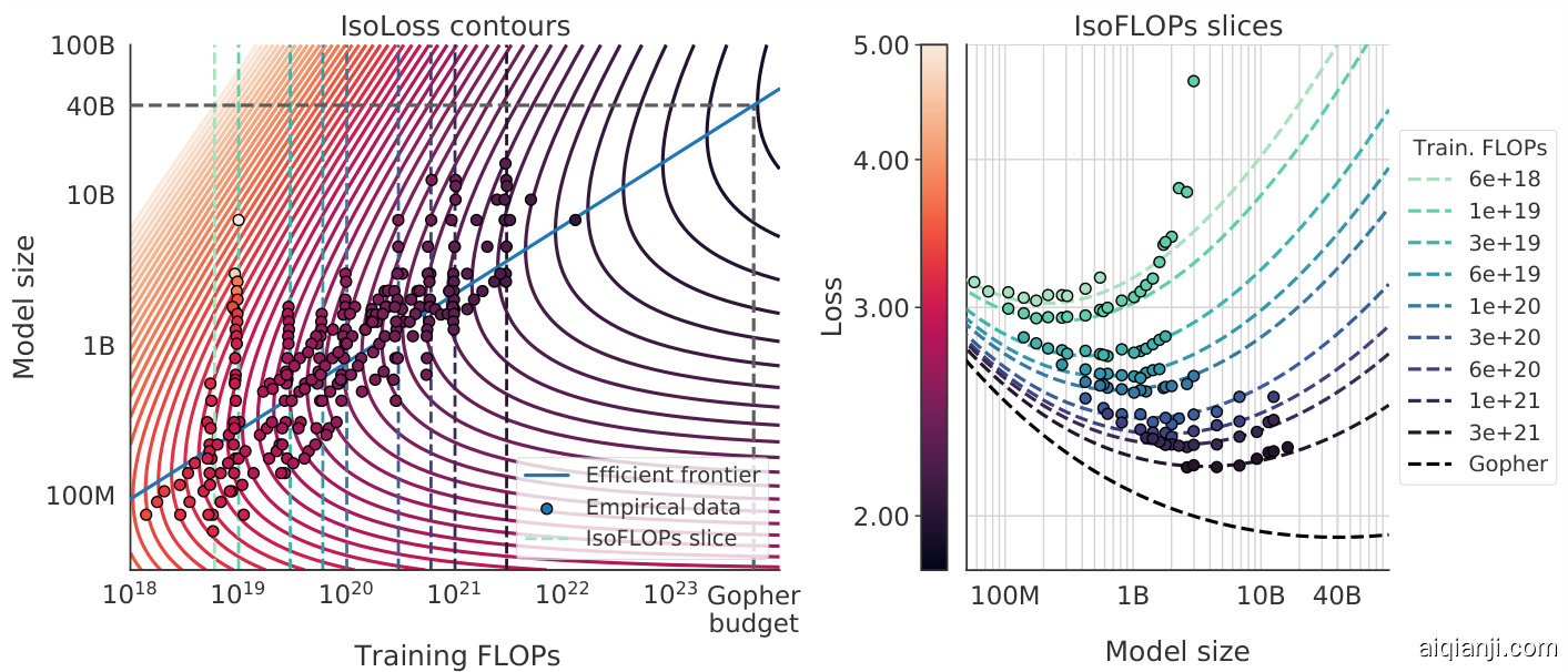 Figure 4 | Parametric fit. We fit a parametric modelling of the loss  $\hat{L}(N,D)$   and display contour (left) and isoFLOP slices (right). For each isoFLOP slice, we include a corresponding dashed line in the left plot. In the left plot, we show the efficient frontier in blue, which is a line in log-log space. Specifically, the curve goes through each iso-loss contour at the point with the fewest FLOPs. We project the optimal model size given the Gopher FLOP budget to be 40B parameters.