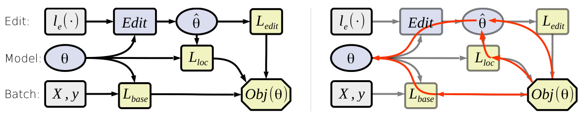 我们的训练过程利用了梯度下降编辑器 (Gradient Descent Editor) (1) 对 $\theta$ 可微的特性。这一众所周知的观点 (Finn et al. (2017)) 使我们能够通过反向传播直接优化编辑器函数 (参见图 1)。