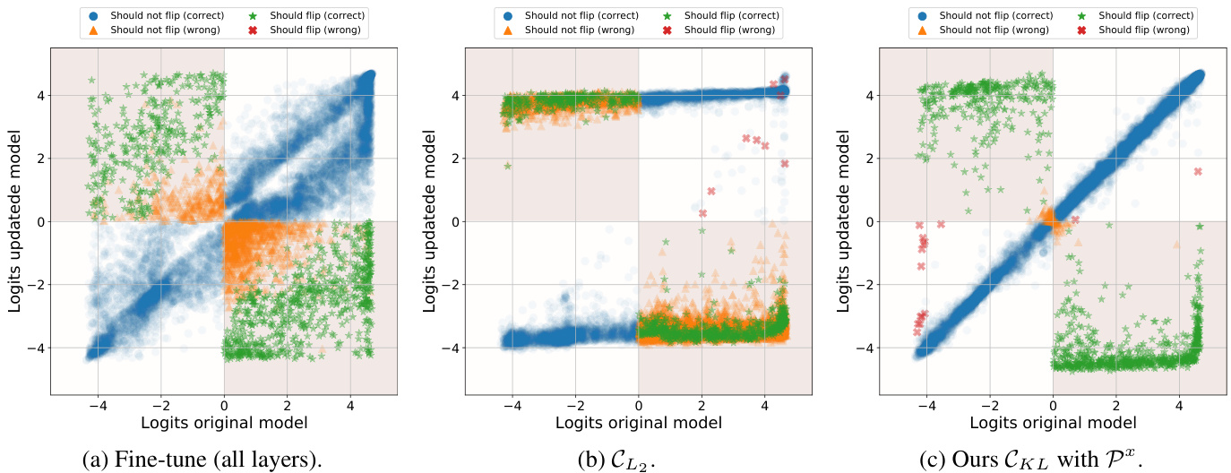 图 3: FEVER任务上原始模型与更新模型的logit分布对比。全层微调(a)会导致大量错误,且预测概率在未跨越决策边界时仍会发生变化。$\mathcal{C}_ {L_{2}}$ (b) 能成功翻转标签,但无法保持预测结果不变。采用完整方法 $\mathcal{C}_{K L}$ 结合 $\mathcal{P}^{x}$ (c) 时,错误主要集中在模型不确定的原点附近,微小扰动即可使logit跨越决策边界。建议查看彩色版本以获得更佳效果。