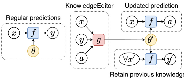 Figure 1: Left: a model   $f$   with parameters   $\theta$  prefers a prediction  $y$   for input  $x$   (e.g.,  $y$   is the mode/argmax of a discrete distribution parameterized by  $f(x;\theta))$  . Right: our method uses a hyper-network   $g$   to update the parameters of  $f$   to  $\theta^{\prime}$   such that   $f(x;\theta^{\prime})$   prefers an alternative prediction   $a$   without affecting the prediction   $y^{\prime}$   of any other input  $x^{\prime}\neq x$  . Our model edits the knowledge about  $x$   stored in the parameters of  $f$  .