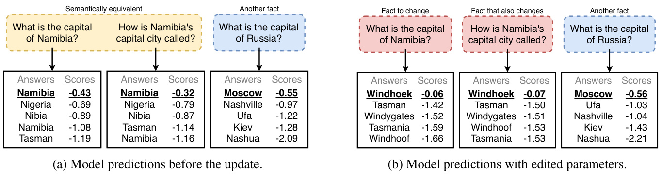 图 2: 经过闭卷问答微调的预训练语言BART模型预测结果。左: 基于束搜索(Beam Search)的模型top-k预测。右: 使用我们的方法将"纳米比亚的首都是什么?"从错误答案"纳米比亚"修正为正确答案"温得和克"后,得到的top-k预测。修改一个事实同时会改变语义等价问题的预测,并保持其他事实的预测不变。