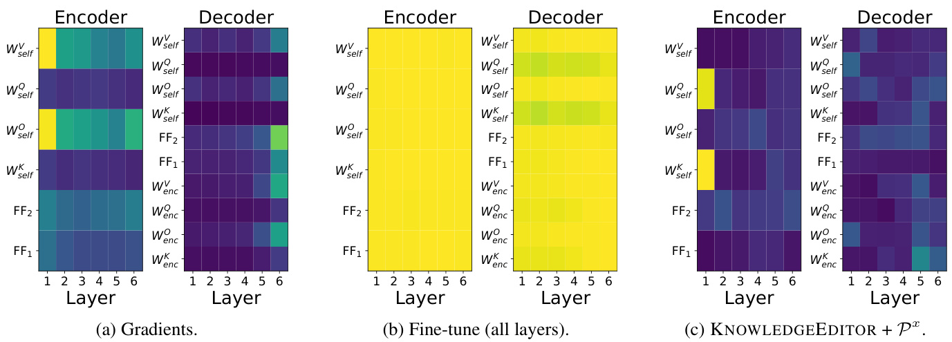 We also report visualization s of the average weight updates for the QA experiment in Figure 4. We report the setting with additional supervision from paraphrases (but the heatmaps are similar without them). There are three main observations from this plot. First, gradients are mostly concentrated on the first encoder layer and the last decoder layer. Gradients explain why the best subset of parameters to update is the first layer. Secondly, fine-tuning does not preserve gradient magnitudes and updates the whole model almost uniformly. That happens because of the optimizer’s adaptive learning rate that initially erases the gradient direction. The gradient direction plays a role only after a couple of gradient steps, but most of the time, the method only needs one step to modify its knowledge. Lastly, our updates are sparser and are not consistent with the gradient for changing the predictions. That indicates that our method learns to use the gradient in a meaningful way (i.e. ignoring some directions or manipulating its magnitude). It is surprising that the knowledge manipulation seems to be achieved by primarily modifying parameters affecting the shape of the attention distribution $(W_{s e l f}^{K}$ and W sQelf ) rather than, e.g., values $(W_{s e l f}^{V})$ . As we discussed, the hyper-network may be regarded as a probe providing insights about the mechanism used by the model to encode the knowledge (Vig et al., 2020). For example, the focus on the bottom layer is already intriguing, as it contrasts with claims that memorization happens in top layers of image classification models (Stephenson et al., 2021), hinting at substantial differences in the underlying memorization mechanisms in NLP and vision. Proper investigation is however outside of the scope of this study. See Appendix C for some additional analysis.