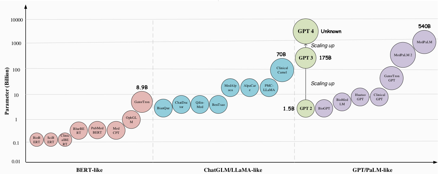 Table 2. Summary of existing medical-domain LLMs, in terms of their model development, the number of parameters (# params), the scale of pre-training/fine-tuning data, and the data source. M: million, B: billion.