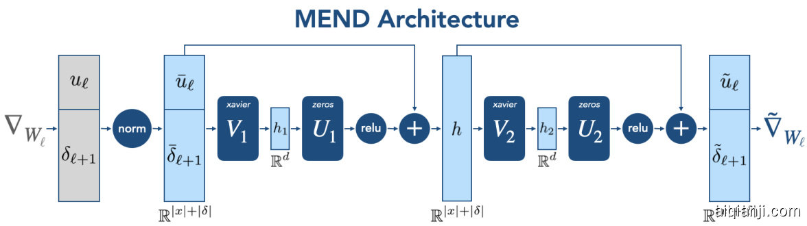 其中 $\sigma$ 是一个非线性激活函数,满足 $\sigma(0)=0$ (本文使用ReLU),且 $U_{j},V_{j}$ 对应于MEND在层 $j$ 的权重低秩分解 (保持MEND总参数量为 $O(d).$ )。