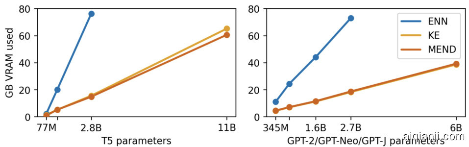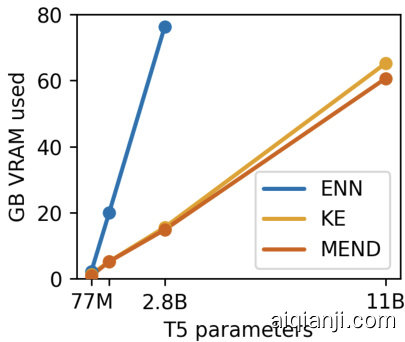 图 4: 训练 MEND、KE 和 ENN 时的 GPU 显存 (VRAM) 占用情况(float32 精度)。MEND 和 KE 的显存占用在单 GPU 上仍可管理(对于 T5-11B 使用 $2\times$ bfloat16 内存占用 (Wang and Kanwar, 2019)),而 ENN 的显存占用增长更快,使得其在单 GPU 上运行不切实际。数值计算未使用梯度检查点。由于内存限制,我们无法估算 ENN 在 T5-11B 或 GPT-J 上的内存占用。