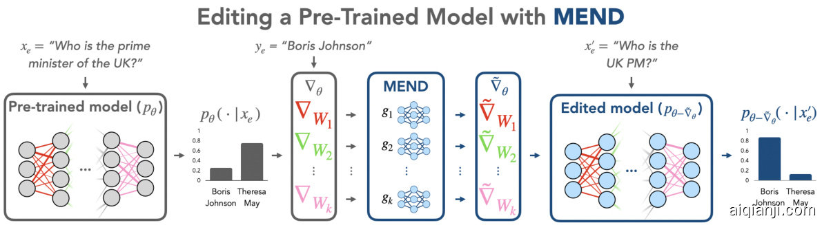 图 1: 提出的MEND算法通过训练一组MLP来修改模型梯度,从而实现编辑能力,这些局部模型编辑不会损害模型在无关输入上的性能。如第5.1节所示,MEND在训练和应用编辑时非常高效,即使对于非常大的模型也是如此。