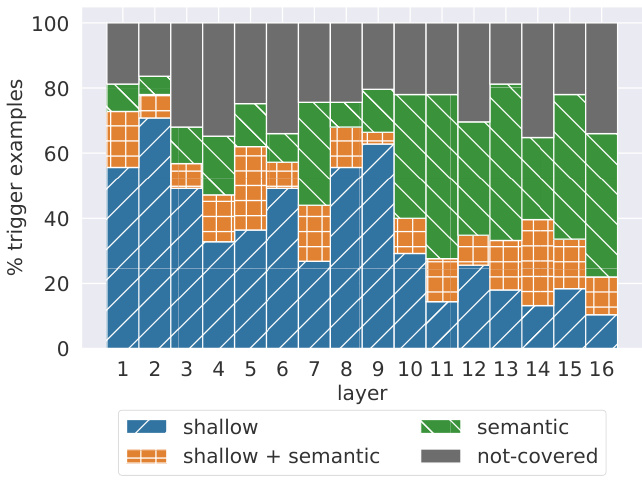 Figure 2: Breakdown of the labels experts assigned to trigger examples in each layer. Some examples were not associated with any pattern (“not-covered”).