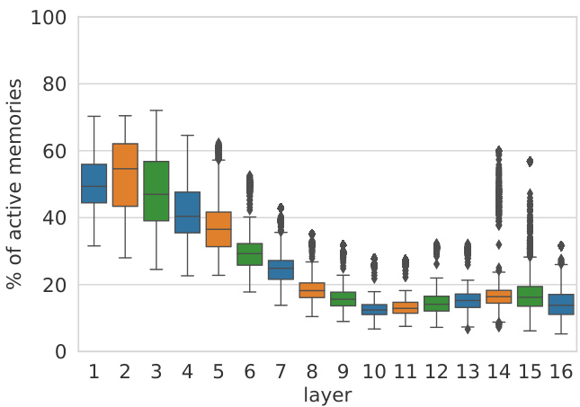 Figure 7: The fraction of active memories (i.e., with positive memory coefficient) out of 4096 memories in every layer, for a random sample of 4,000 examples.